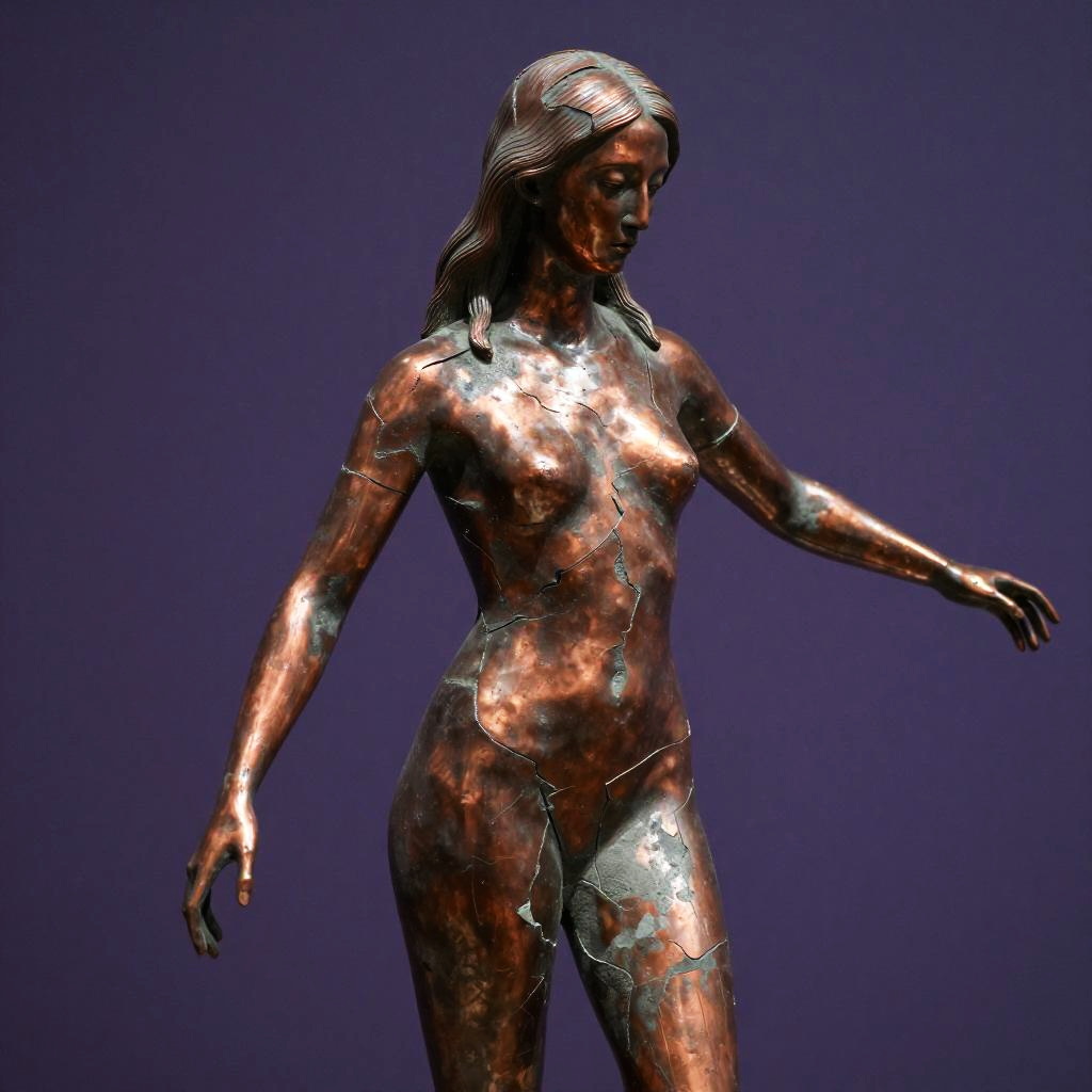 Realistic photo.copper sculpture of a woman with long hair and deeply cracked surface, dynamic action, minimalist features, surrealist sculpture, purple background, concrete art, atmospheric and introspective mood that conveys emotion in its imperfections, ultra-detailed, high quality with striking textures and depth, ideal for an impressive display of artistry. realistic photo