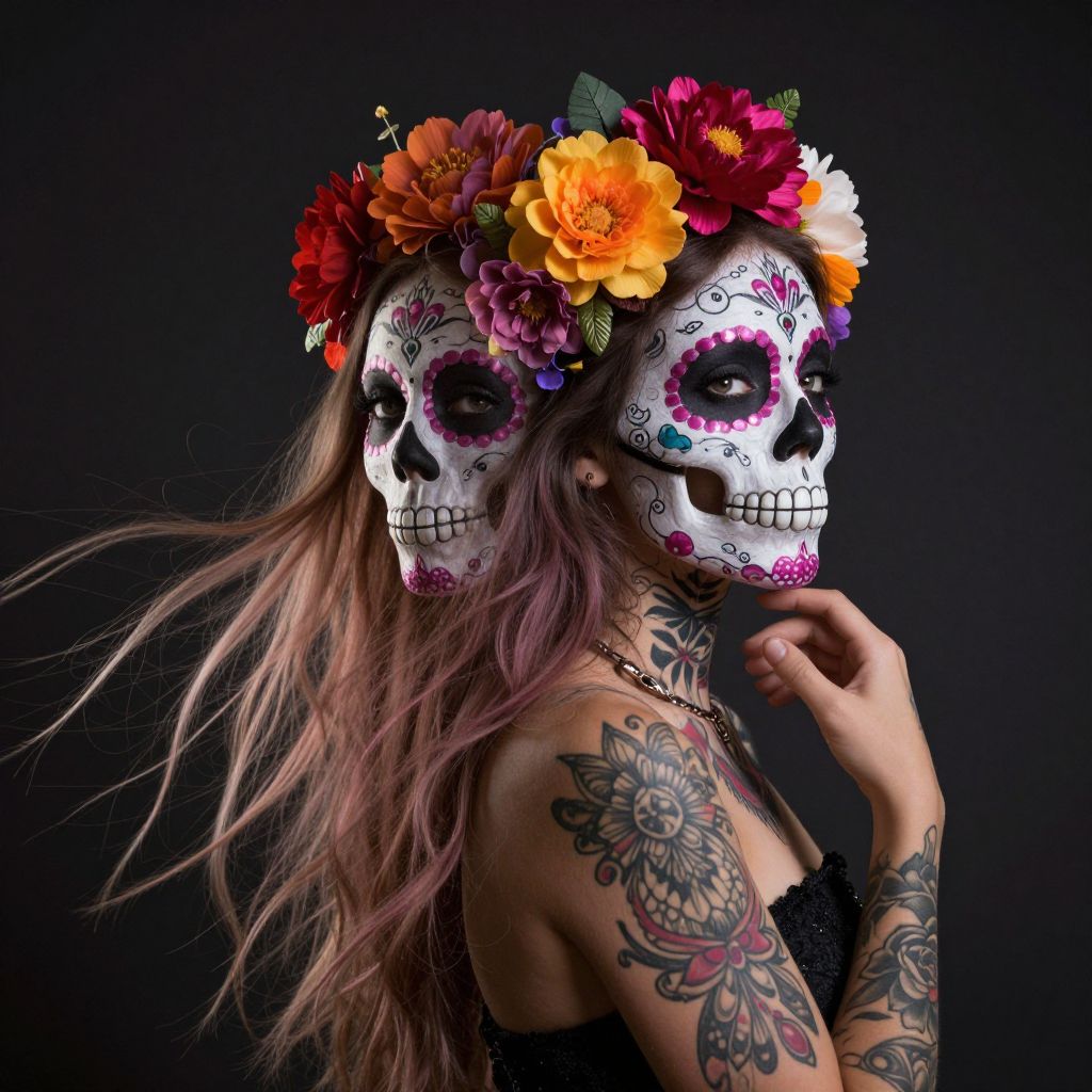 Photograph of a woman with long, wavy, light brown hair wearing a vibrant Day of the Dead skull mask adorned with colorful floral patterns in pink, purple, and black. A vivid flower crown featuring orange, red, yellow, and pink flowers rests on her head. She has extensive black and grey tattoos on her right arm and shoulder, including a large sunflower design. She's dressed in a black lace top, and her right hand is gently touching her chin. The background is solid black, making her colorful mask and floral crown stand out. The image has a dramatic, high-contrast style.