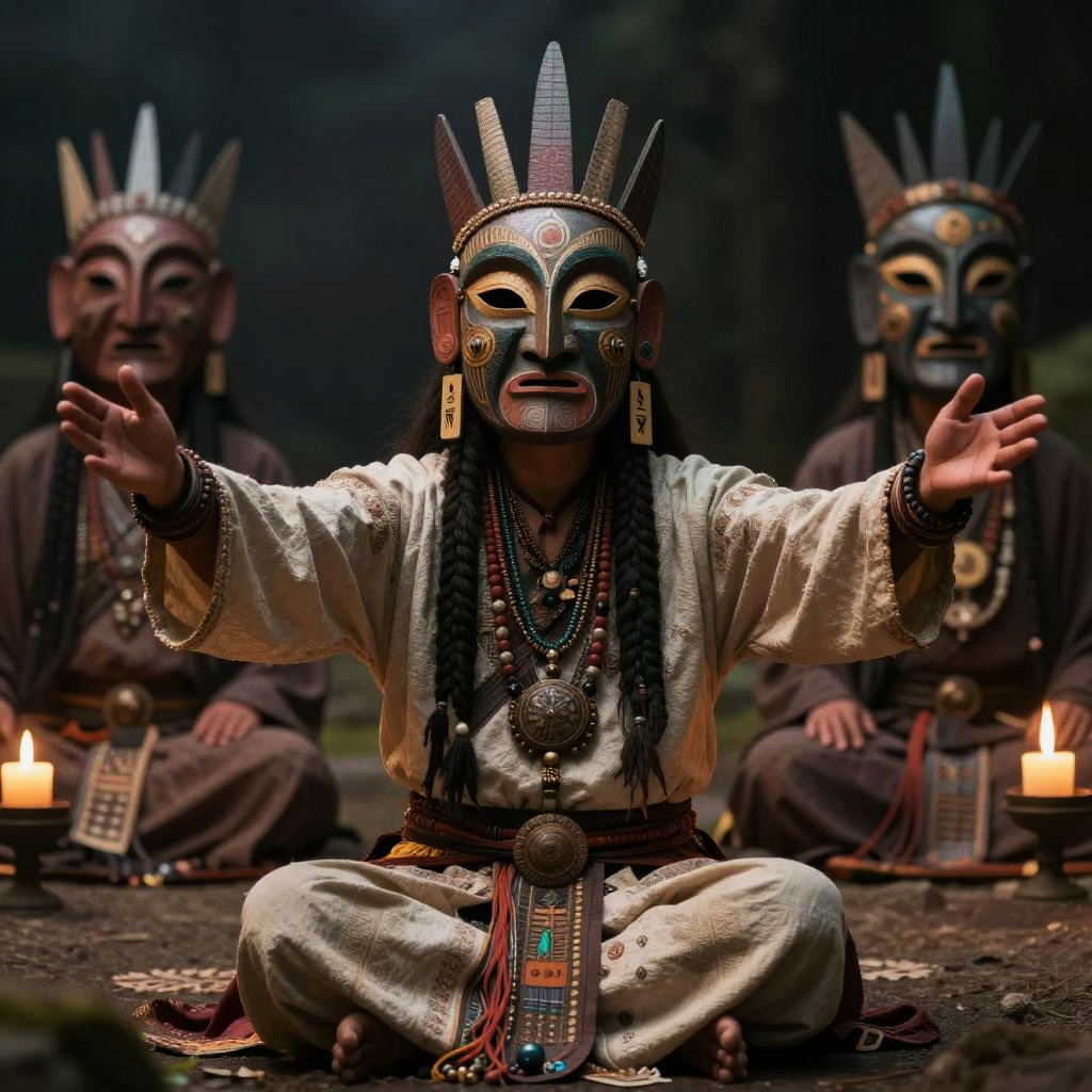 Realistic photo.An ancient shaman channeling spirits in a powerful ritual, arms outstretched, tribal masks, spiritual awakening, mystical. realistic photo