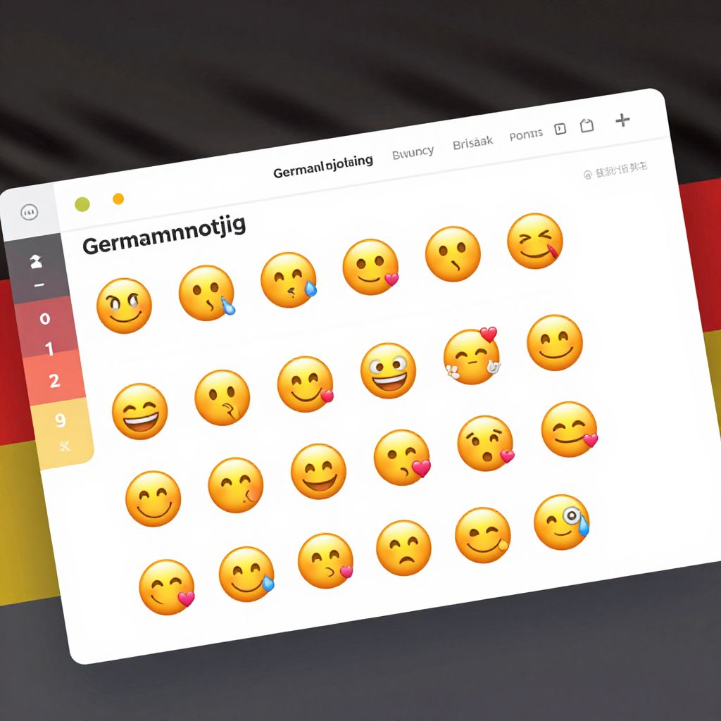 German emoticons website, a vibrant digital interface filled with expressive emoticon icons, sleek modern design, subtle German flag colors in the background, friendly user experience, clean typography, high-tech futuristic style