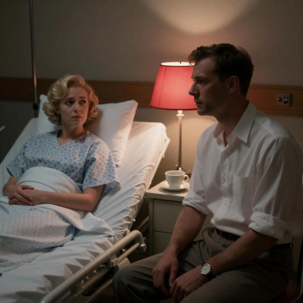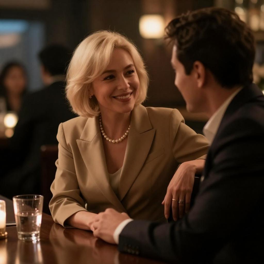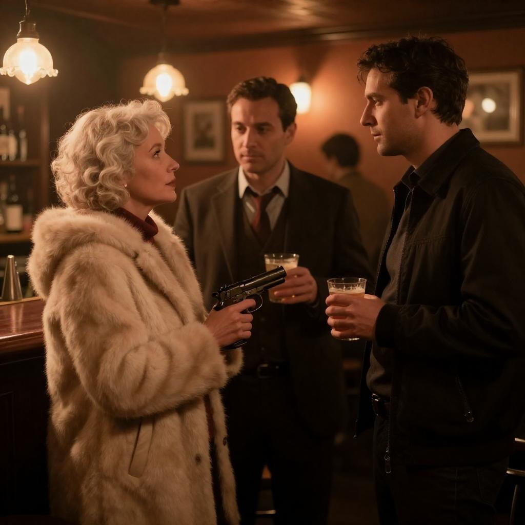 Photograph of a dimly lit, cozy bar with warm, orange lighting. Three people, two men and one woman, stand close together. The woman, with short, curly white hair and a beige fur coat, holds a gun in her right hand and a drink in her left. The men, one in a dark suit and the other in a black jacket, also hold drinks. The background shows blurred, warmly lit figures and framed pictures on the wall.