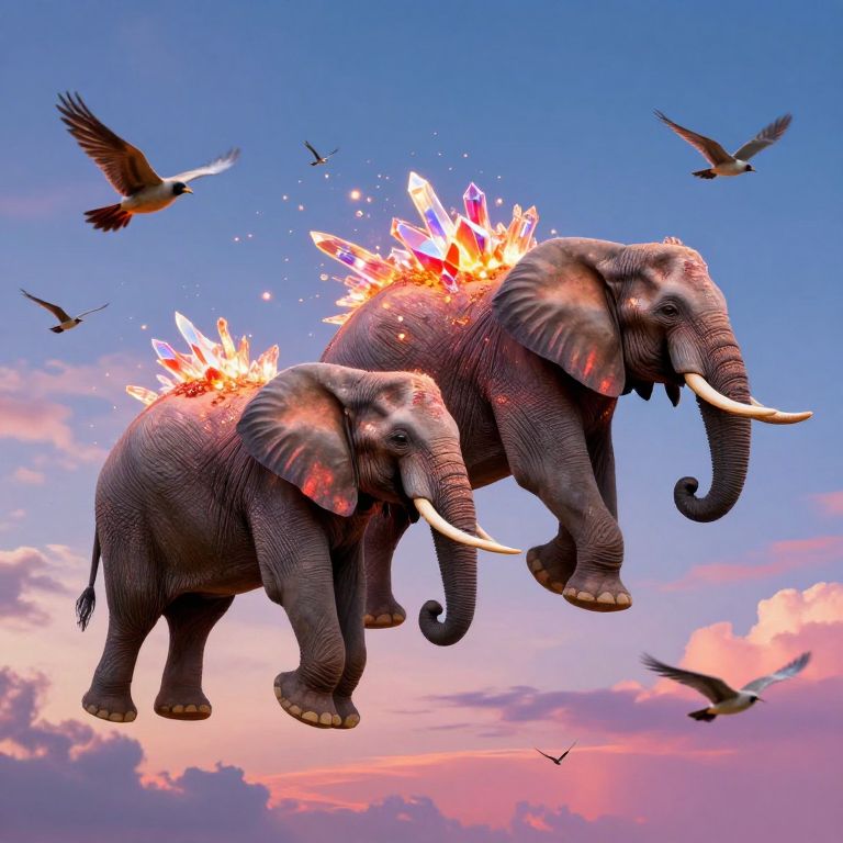 A surreal digital artwork depicts two elephants soaring through a vibrant sky, their bodies adorned with fiery crystalline bursts and surrounded by floating birds, evoking a fantastical, otherworldly atmosphere reminiscent of cyberpunk and fantasy art styles.