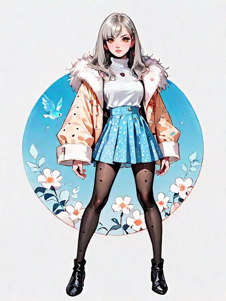 1girl, source_comics, realistic face, full body shot, Woman, contemporary chic, light gray turtleneck top, faux fur coat in soft lilac, three-quarter sleeves, cropped length, floral printed mini skirt in navy and orange tones, sheer black tights with polka dots, white studio background