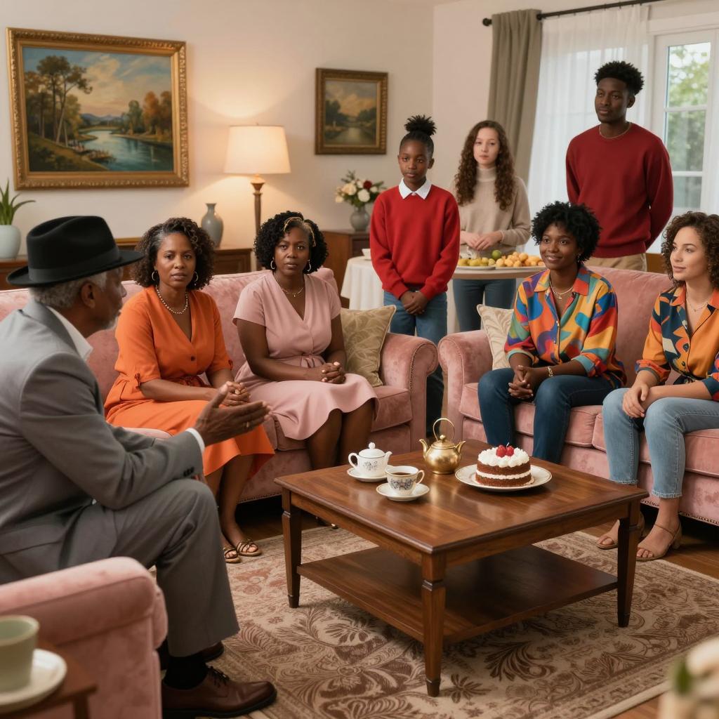 Living room scene. 9 people, diverse ethnicities. Elderly Black man in gray suit, black hat, gesturing. Seated women in orange dress, pink dress, colorful blouse. Coffee table with tea set, cake. Pink sofa, brown carpet. Framed painting, lamps. Child in red sweater, standing. Casual conversation. Warm lighting. Background table with food, decorations.