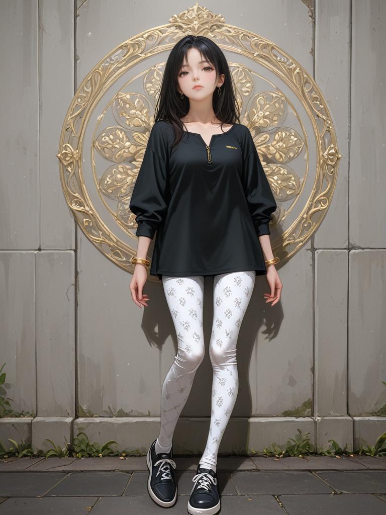 1girl, realistic face, full body shot, Woman, bohemian, black long-sleeve top with elephant graphic, scoop neck, brown suede shorts with fringe, wide-brimmed floppy hat, layered necklaces.