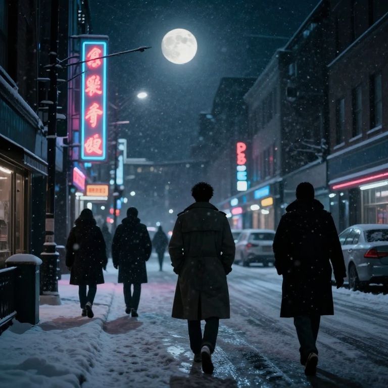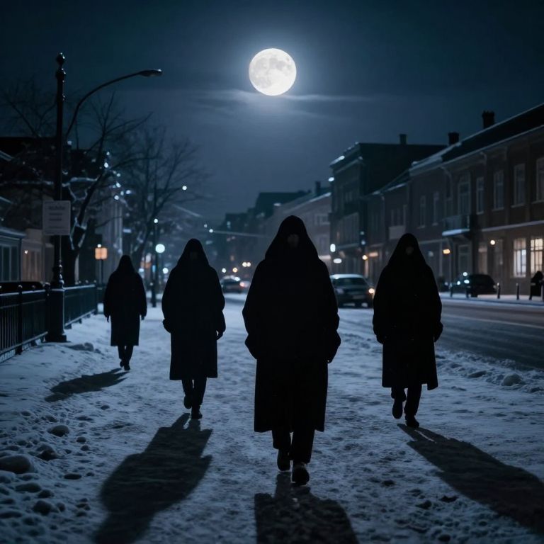 Under a luminous moon, cloaked figures traverse a frosty urban landscape where the air hums with an otherworldly stillness, their faces obscured by shadows that seem to whisper secrets of a hidden, noir-inspired realm.