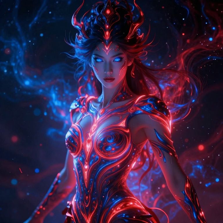 Digital art of a glowing, ethereal woman with blue eyes, fiery red and blue armor, and flowing hair, set against a dark, starry