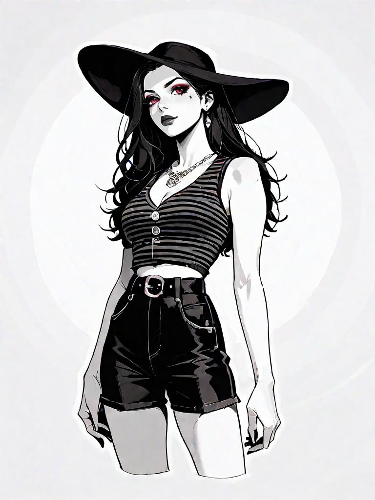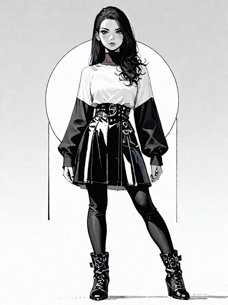 1girl, source_comics, realistic face, full body shot, Woman, trendy fashion, sleeveless crop top in a neutral shade with a sweetheart illusion neckline, geometric cut-outs, paired with a high-waisted skirt featuring bold black and white geometric patterns, mini skirt length, straight-cut silhouette.