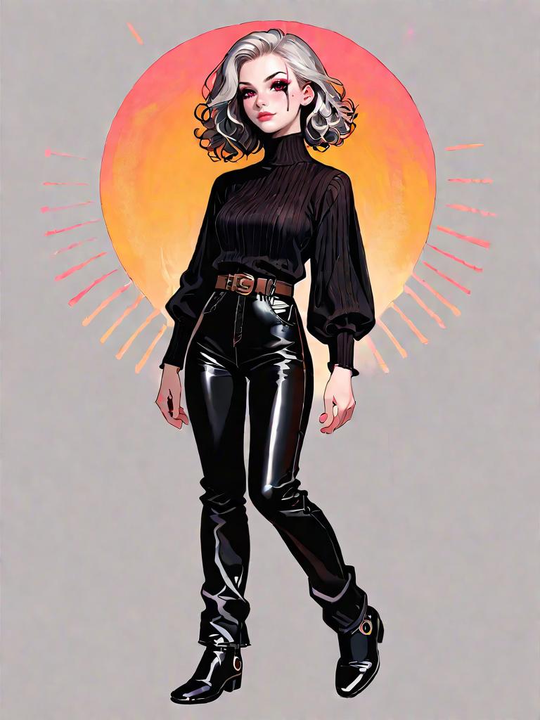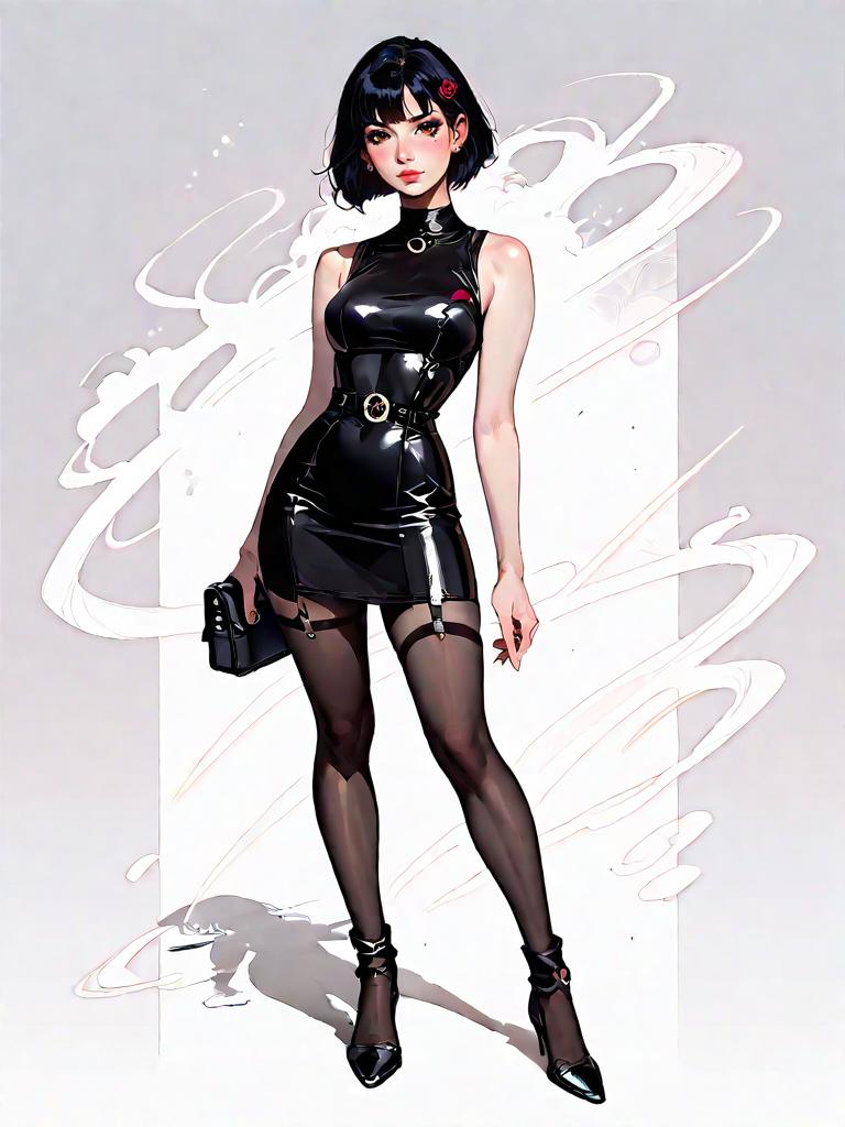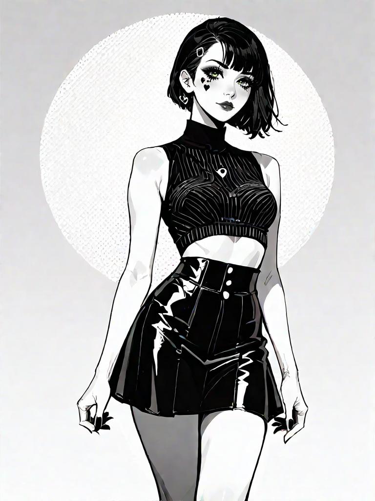 Monochrome digital illustration of a young woman with short black hair and striking green eyes. She wears a sleeveless black crop top with a sweetheart illusion neckline and pinstripe pattern, paired with a high-waisted, shiny black mini skirt with a straight cut silhouette. The background features a textured circular white pattern on a light grey gradient. The character has a heart-shaped beauty mark on her cheek and wears small hoop earrings and a pendant necklace, styled in trendy, edgy fashion.