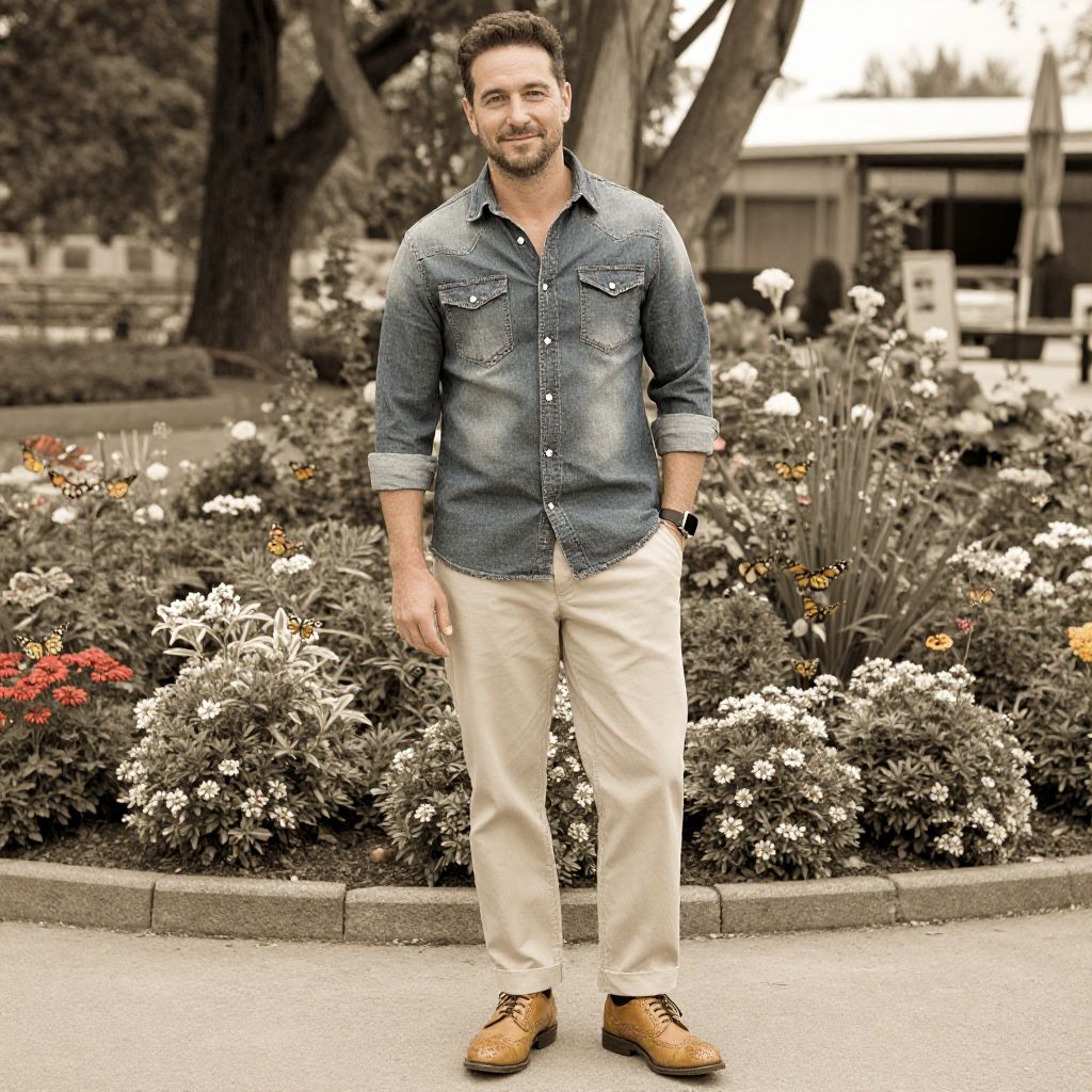 A man, faded denim shirt with rolled sleeves, beige chinos, tan leather brogues, relaxed fit, colorful butterfly garden, sepia effect, gentle smile, enjoying the moment. Man has masculine face and piercing eyes