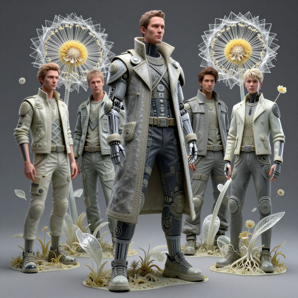Complex intricate hyper detailed ultra sharp 3 d render of a beautiful porcelain biomechanical man, hyper realism, editorial, dslr, 84 mm, streetwear, techwear, cyberpunk style outfit, full body, realism, detailed portrait, intricate complexity, by greg rutkowski, cushart krentz, artgerm, ross tran, conrad roset, portrait, cyberpunk art nouveau, haute couture alexander mcqueen leaves stems dahlia transparent fractal crystalline dandelion yellow pistil filigree roots, intricate details, octane render, volumetric cinematic lighting, 8 k,