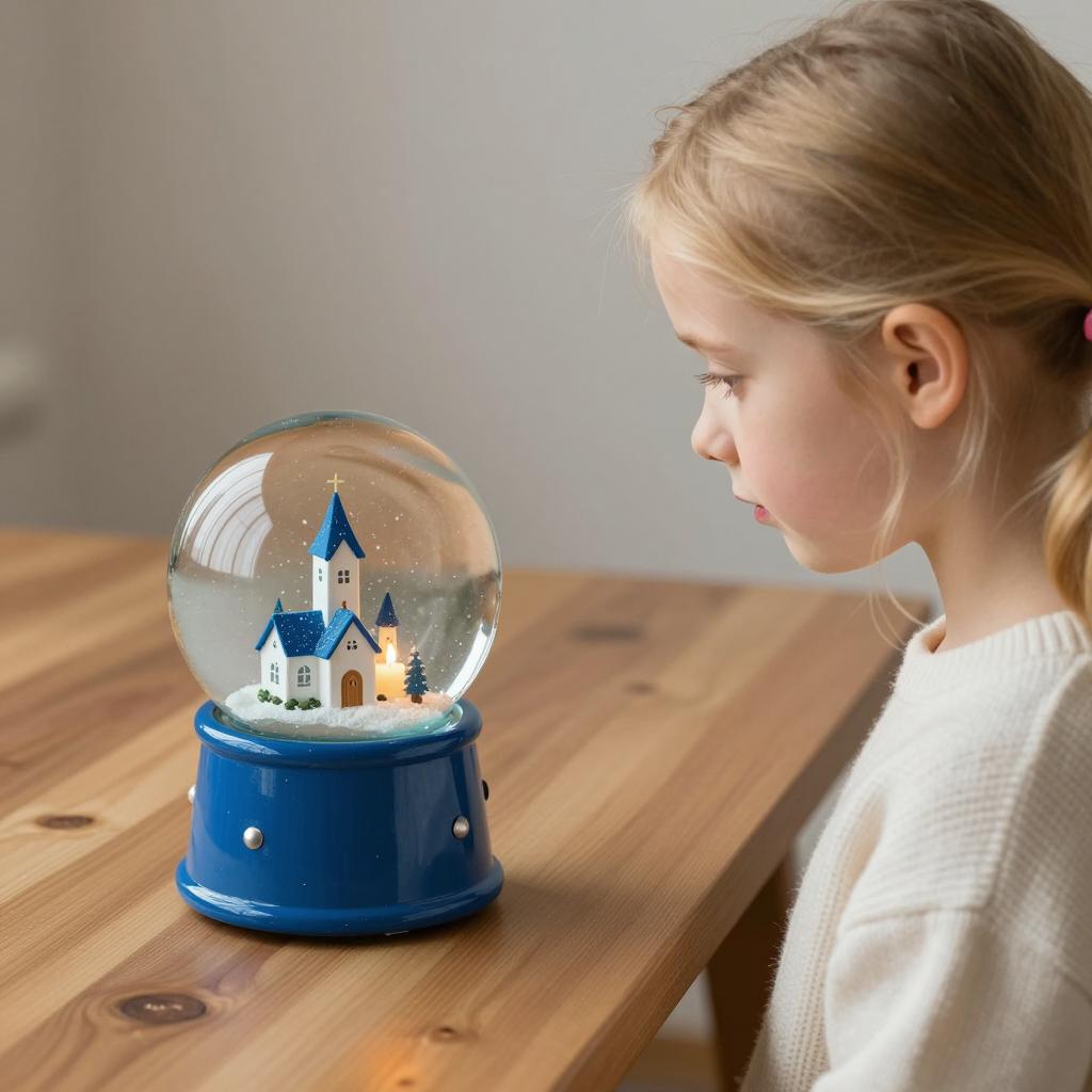 Blonde girl with side ponytail and pink hair tie, white sweater, gazing at blue snow globe on wooden desk. Snow globe has white church and candle. Warm, soft lighting, wooden desk in background. Girl's profile, right side, focused on globe.