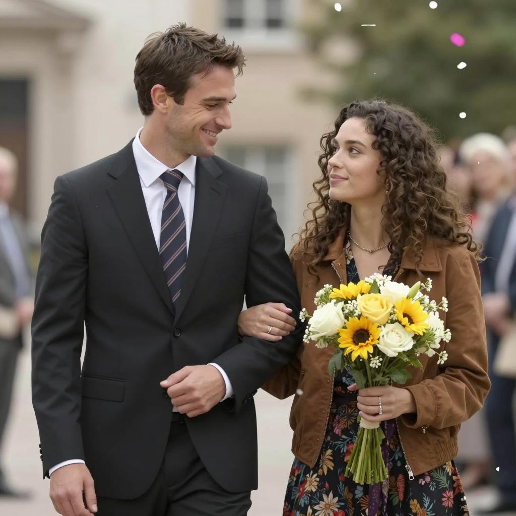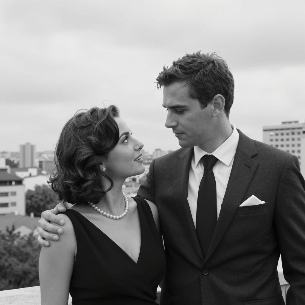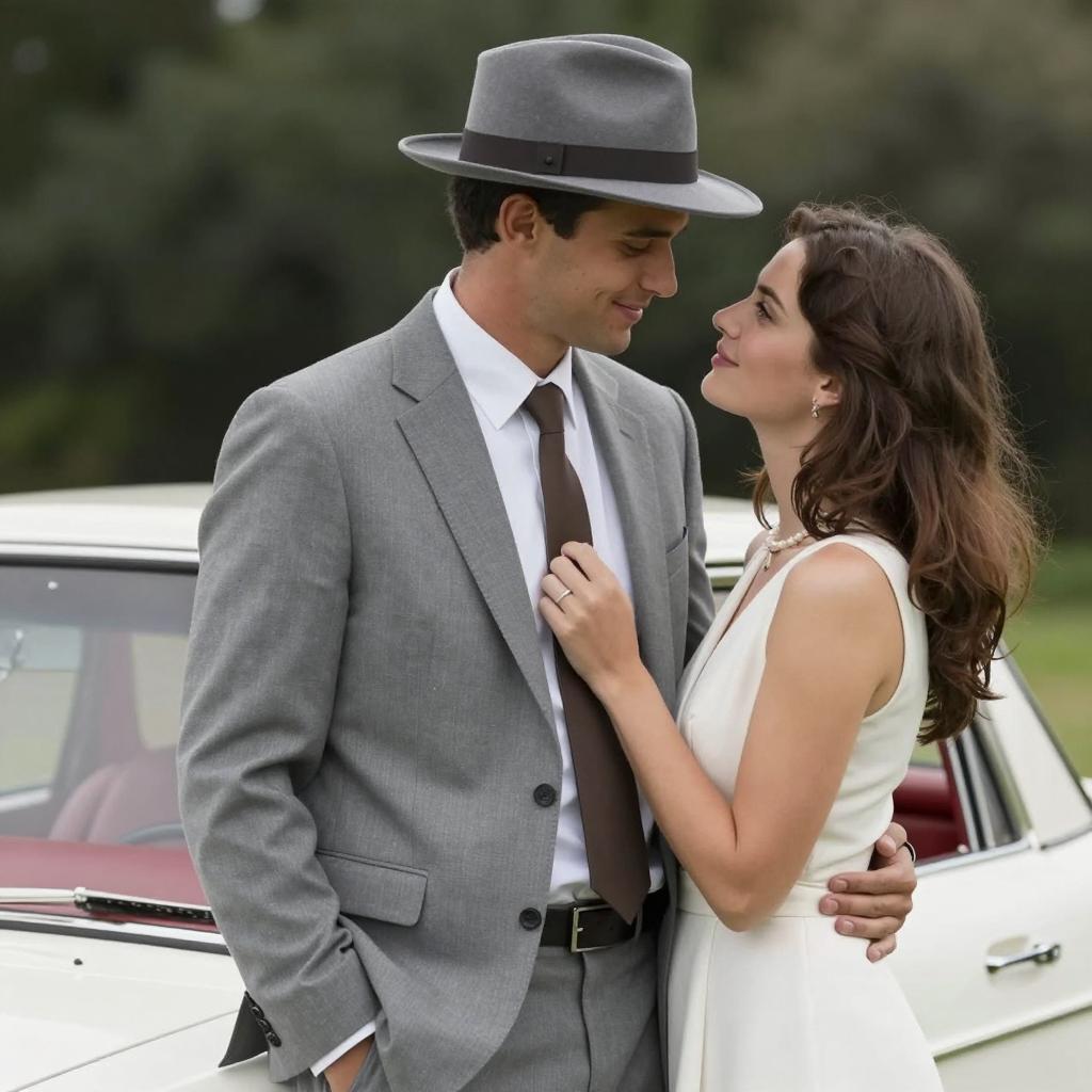 Photograph of a man and woman standing close in front of a white car with a red interior. Man in grey suit, white shirt, brown tie, and grey hat. Woman in white dress, brown hair. Man looks down, woman gazes up. Man's hands on woman's waist, woman's hands on his tie. Background has green foliage. Both smiling. Classic car's roof visible.