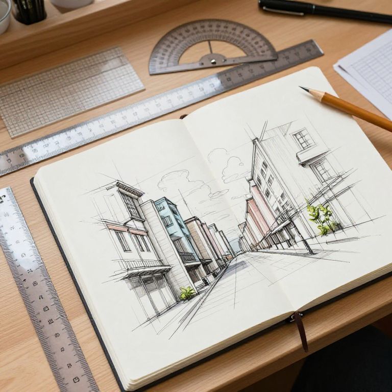 Perspective drawing tools arranged on a wooden artist's desk, including rulers, protractors, and perspective grids, soft natural lighting with a sketchbook showing urban architectural sketches, realistic style, warm tones