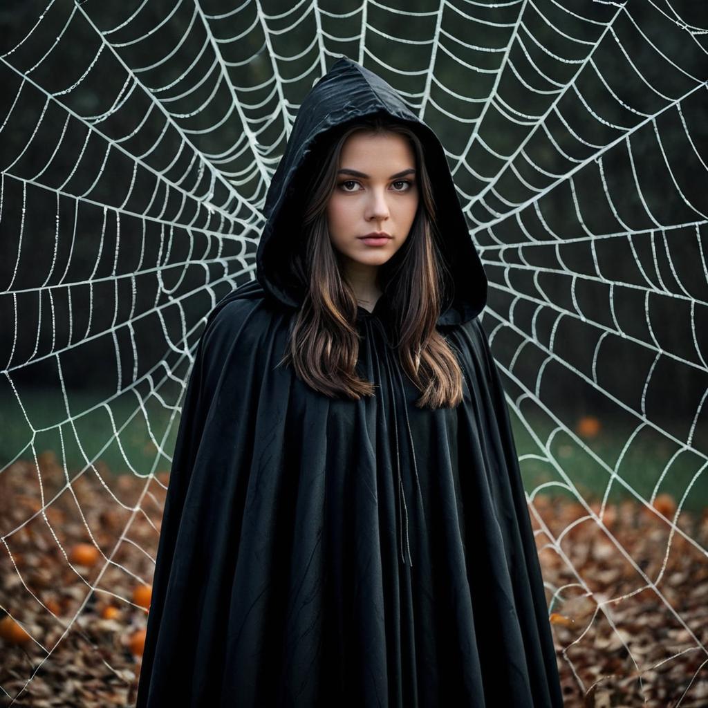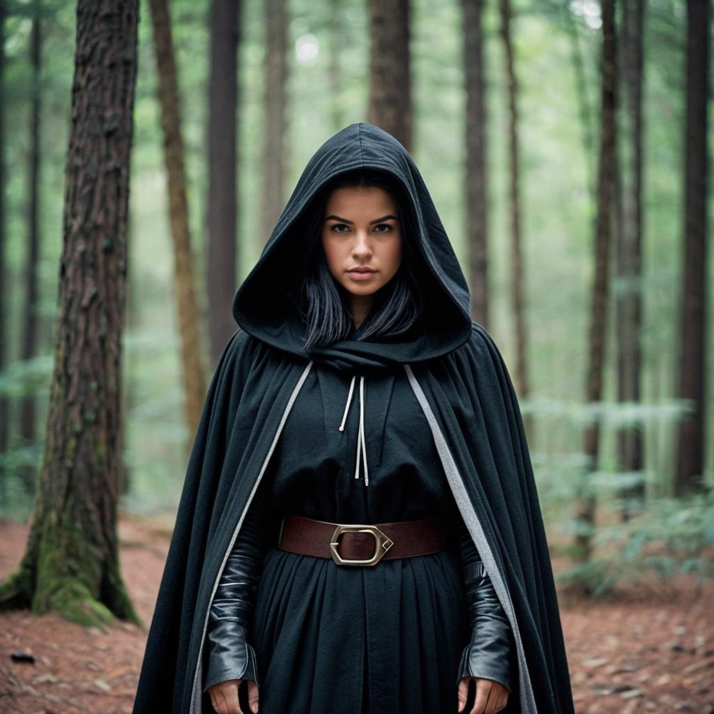Green skittle costume,1girl, solo, outdoors, realistic, brown hair, cosplay, blurry, hood, buttons, scar, looking at viewer, tree, blurry background