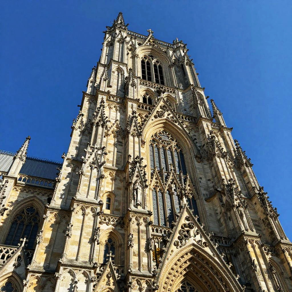 Photograph of Notre-Dame Cathedral's towering Gothic facade bathed in sunlight, showcasing intricate stone carvings against a vibrant blue sky.