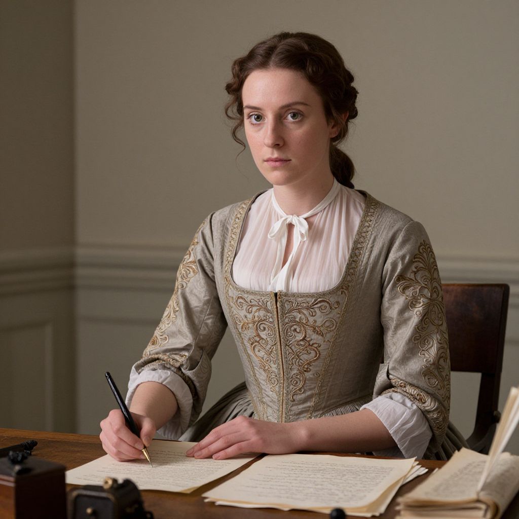 Photograph of a young woman with pale skin and dark brown, wavy hair in a simple bun, sitting at a wooden desk. She wears an ornate, 18th-century-style, grey dress with intricate gold embroidery and a white, high-collared blouse with a lace trim. She holds a quill pen in her right hand, poised over an open parchment document. The background is a plain, light-colored room with white wainscoting. Her expression is focused and slightly serious. The desk also has an open book and a black inkwell in the foreground. The lighting is soft and natural, highlighting her features and the texture of her dress.