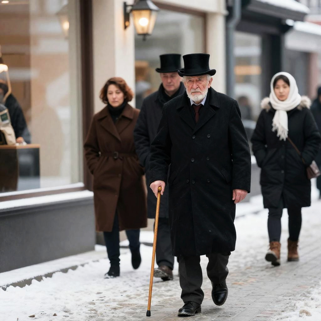 Photograph of an elderly man in a black top hat and long coat walking in front, cane in hand. Three people behind: woman in brown cloak, man in dark coat, woman in white headscarf. Snowy street, shop window, lantern.