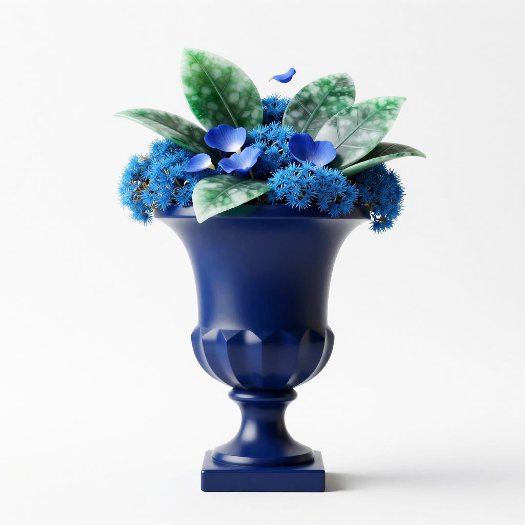 Photograph of a dark blue, ornate ceramic vase with a fluted base and pedestal, filled with artificial green leaves and blue flowers. The leaves are broad and slightly marbled, while the flowers are small, spherical, and vivid blue. Surrounding the flowers and leaves are clusters of blue spiky foliage. The vase is centered against a stark white background, highlighting the vibrant colors and textures of the artificial plants. The overall composition is elegant and symmetrical, with a focus on contrast and color.