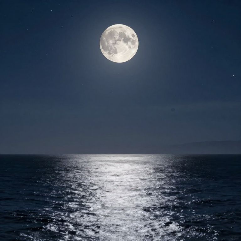 Photograph of a nighttime ocean scene with a large, bright full moon in the dark blue sky. The moon's reflection shines brightly on the calm, slightly rippled ocean surface, creating a shimmering path of light. Tiny, scattered stars dot the sky around the moon. The horizon is barely visible, blending into the dark sea. The overall color palette includes deep blues and silvery whites, evoking a serene and mystical atmosphere.