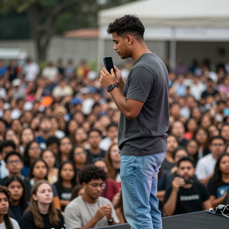 Concerto jesus christ as modern youngster, who is doing his hill sermon among huge crowd and wearing modern dress like jeans and tshirt, having mobile phone in his one hand, ultra realistic, 8K v5,