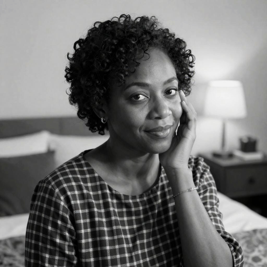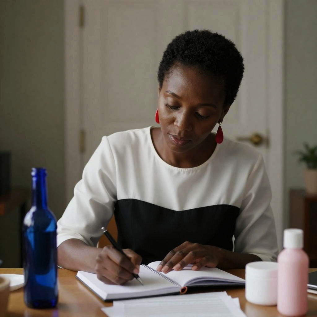 African-American woman with short black hair, red earrings, white blouse, black top, writing in a notebook. Desk with blue glass bottle, white jar, pink bottle, and scattered papers. Dimly lit room, closed door in background. Focused expression.