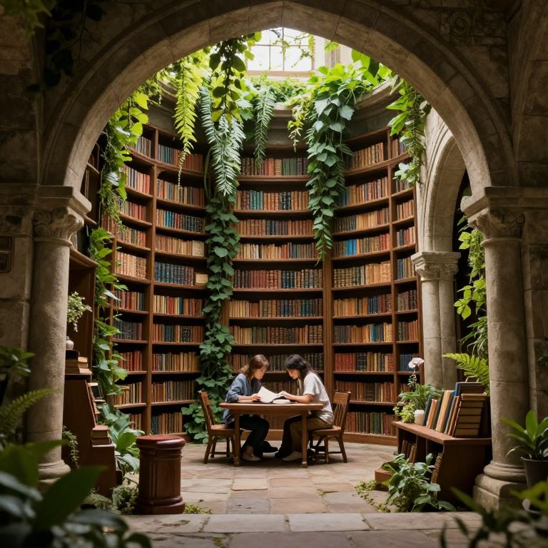 Photograph of a tranquil library with an arched stone ceiling. Two people, one in a blue shirt and the other in white, sit at a wooden table in the center, engaging with a book. Surrounding them are tall, lush green plants and vines climbing the shelves filled with colorful, bound books. The room is lit by natural light filtering through the arch above, casting a warm glow. Stone columns frame the archway, and potted plants are placed on the stone floor. The atmosphere is serene and scholarly.