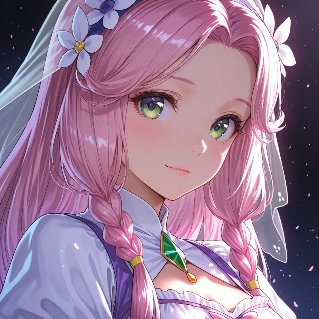 Hanami kotoha, precure, 1girl, green eyes, multicolored eyes, flower in eye, pink hair, long hair, twin braids, hair flower, magical girl, magical girl, by artist hamushima, dark_illustrious
