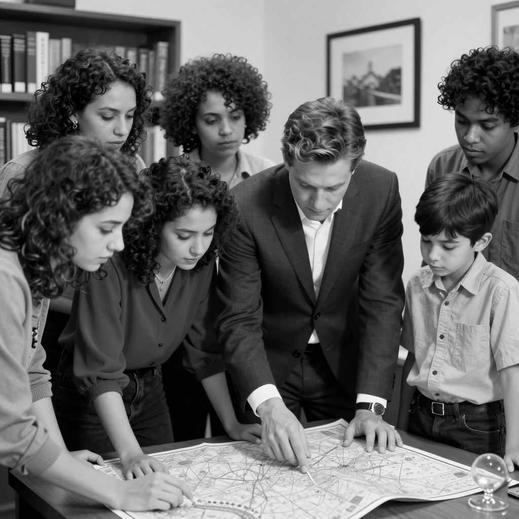 Five people at a wooden table. Middle-aged man in suit and tie, center, serious expression. Woman with short curly hair, left, pointing at a map. Older man, right, leaning forward. Young boy, right, looking at map. Woman with wavy hair, back, partially visible. Shelves with books and ceramic vase in background. Map on table. Clock and ashtray on table.