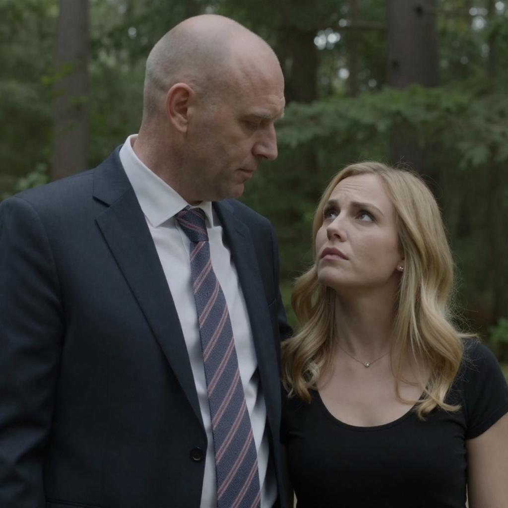 Photograph of a serious woman with short curly blonde hair wearing a black dress, standing close and facing a bald man with blue eyes dressed in a white shirt, black tie, and black jacket. Both have fair skin. The background features a window with purple curtains and light sky visible outside, creating a dimly lit indoor setting.