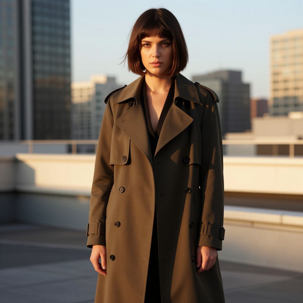 Woman with undercut with soft layers hairstyle posing on a rooftop in a modern metropolis, surrounded by golden-hour sunlight, wearing a trendy trench coat and minimal makeup, exuding bold confidence and urban elegance.