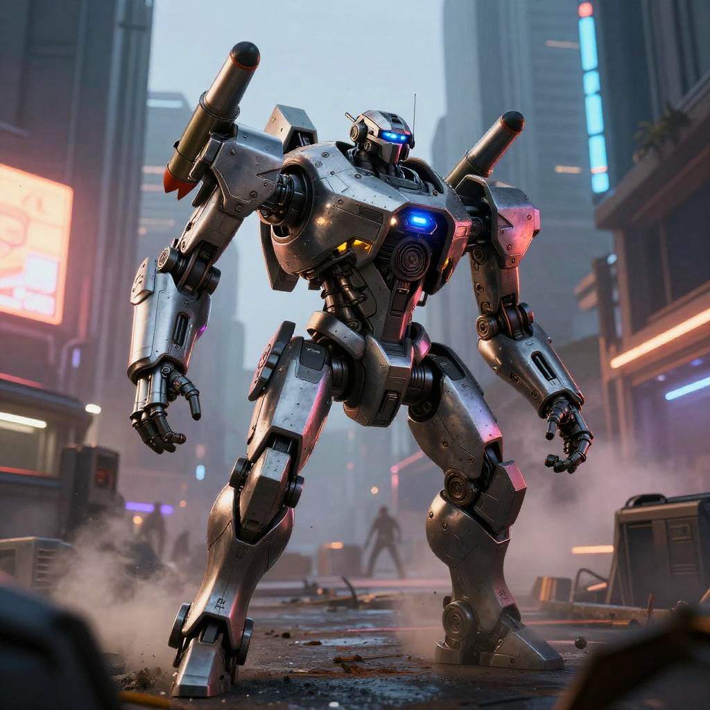 Titanfall mech navigating an urban warzone at dusk, neon lights reflecting off sleek metallic surfaces, dynamic pose with missile launchers ready, gritty smoke and debris in background