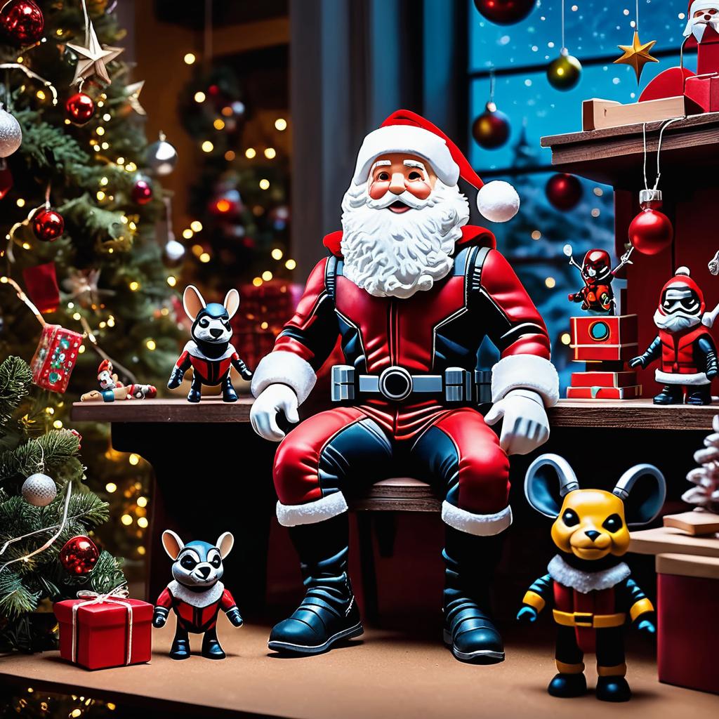 Detailed image of a figure dressed as Ant-Man wearing a Santa Claus outfit, standing in a brightly decorated toy-making workshop. The scene features vibrant red and green holiday colors, festive decorations including miniature Christmas trees, ornaments, and toy figures. The character wears black gloves, boots, and glasses integrated with his Santa suit. Warm, cinematic lighting enhances the whimsical and magical winter atmosphere.