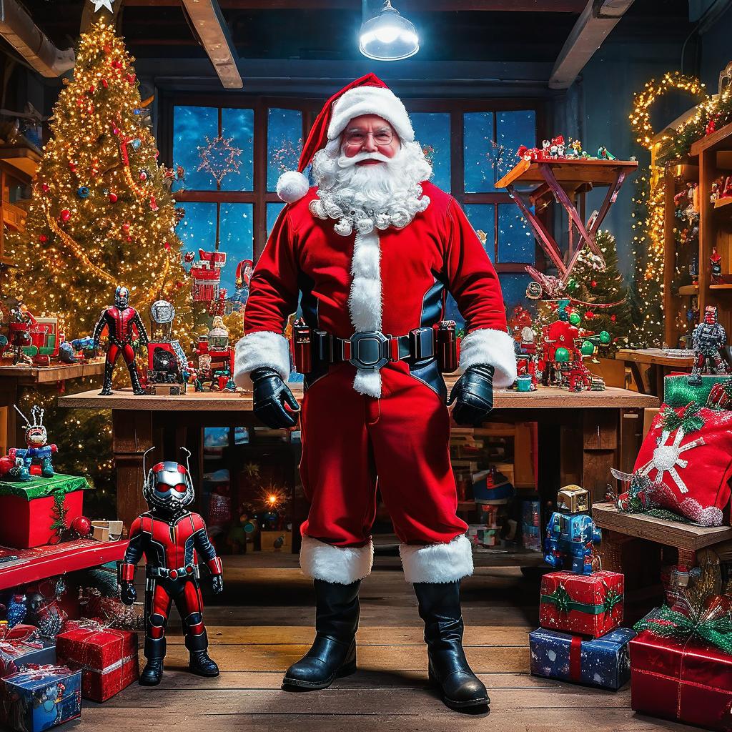 Ant-Man from Marvel series depicted as Santa Claus, wearing a festive red suit with superhero elements, in a toy-making workshop. The scene includes holiday decorations, twinkling lights, and a joyful, magical atmosphere. Highly detailed, vibrant colors, with a mix of realism and comic book style, cinematic lighting, whimsical winter vibes.