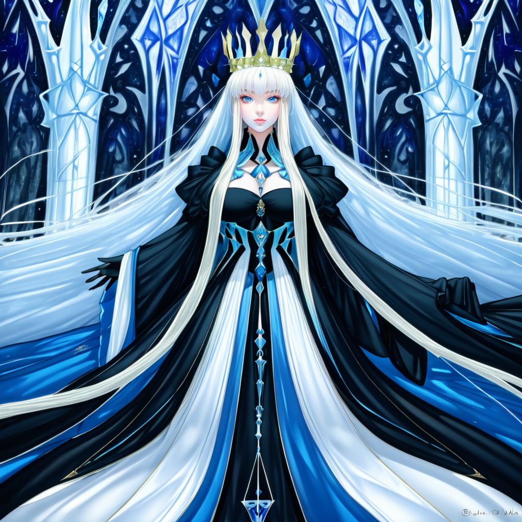 Morgan le fay (queen of winter) (fate), fate/grand order, 1girl, blue lips, blue eyes, very long hair, grey hair, white hair, ponytail, sidelocks, french braid, braid, large breasts, black dress, two-tone dress, veil, black gloves, long sleeves, wide sleeves, crown, by artist abenattou, anime