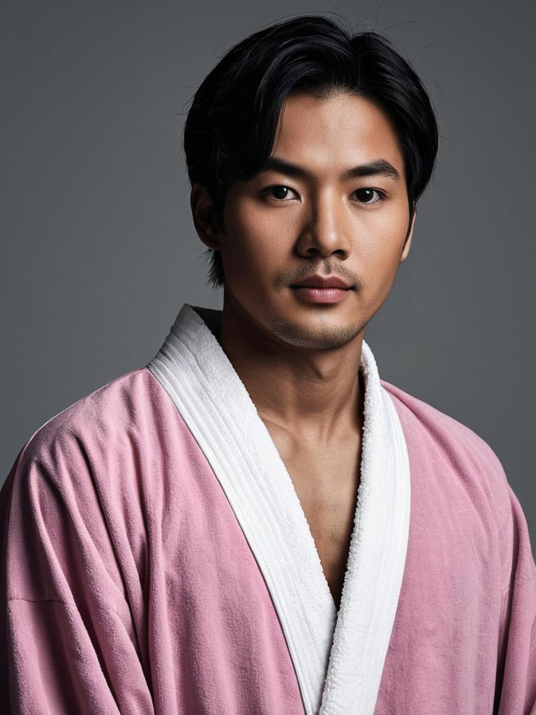 Pink clothes male costume, solo, 1boy, male focus, black hair, looking at viewer, simple background, realistic, white background, long sleeves, black eyes, asian, robe, grey background, dark-skinned male, short hair, dark skin, upper body