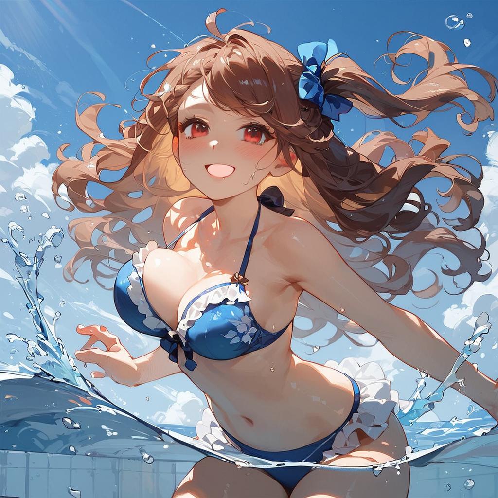 Score_9, score_8_up, score_7_up, source_anime, rating_sensitive, sexually suggestive, 1girl, solo, smile, joyful, bouncing breasts, outdoors, pool, sunbeam, partially submerged, splash, long hair, brown hair, wavy hair, one side up, hair bow, brown eyes, medium breasts, bikini, frills, lace trim, thighs, detailed eyes, eye reflection