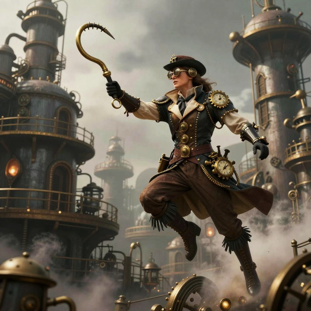 Realistic photo.Steampunk-themed artwork of a fearless personal commentsurch master wielding a brass grappling hook with clockwork mechanisms woven into fabric, leaping onto a twisting, steam-filled laboratory. realistic photo