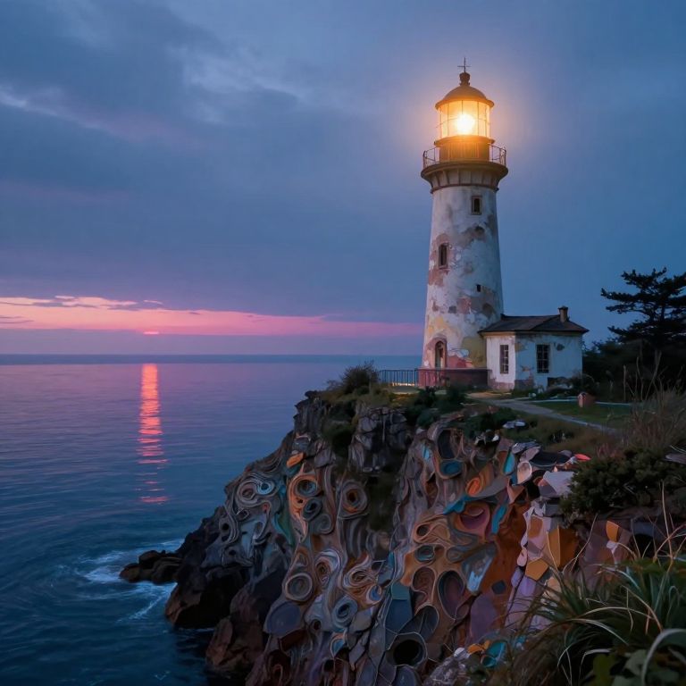 A captivating digital art composition reminiscent of Simon Stålenhag's unique blend of nostalgia and intrigue portrays a solitary lighthouse illuminating a mysterious beach at twilight. The serene yet haunting scene features the warm glow of the lighthouse contrasting with the cool, ethereal gradient of blues and purples merging between the ocean and sky. A vintage-style automobile appears partially buried in the sand near the water's edge, its chrome elements reflecting the lighthouse's radiant light, adding to the dreamlike atmosphere that evokes a sense of both nostalgia and enigma for the viewer.