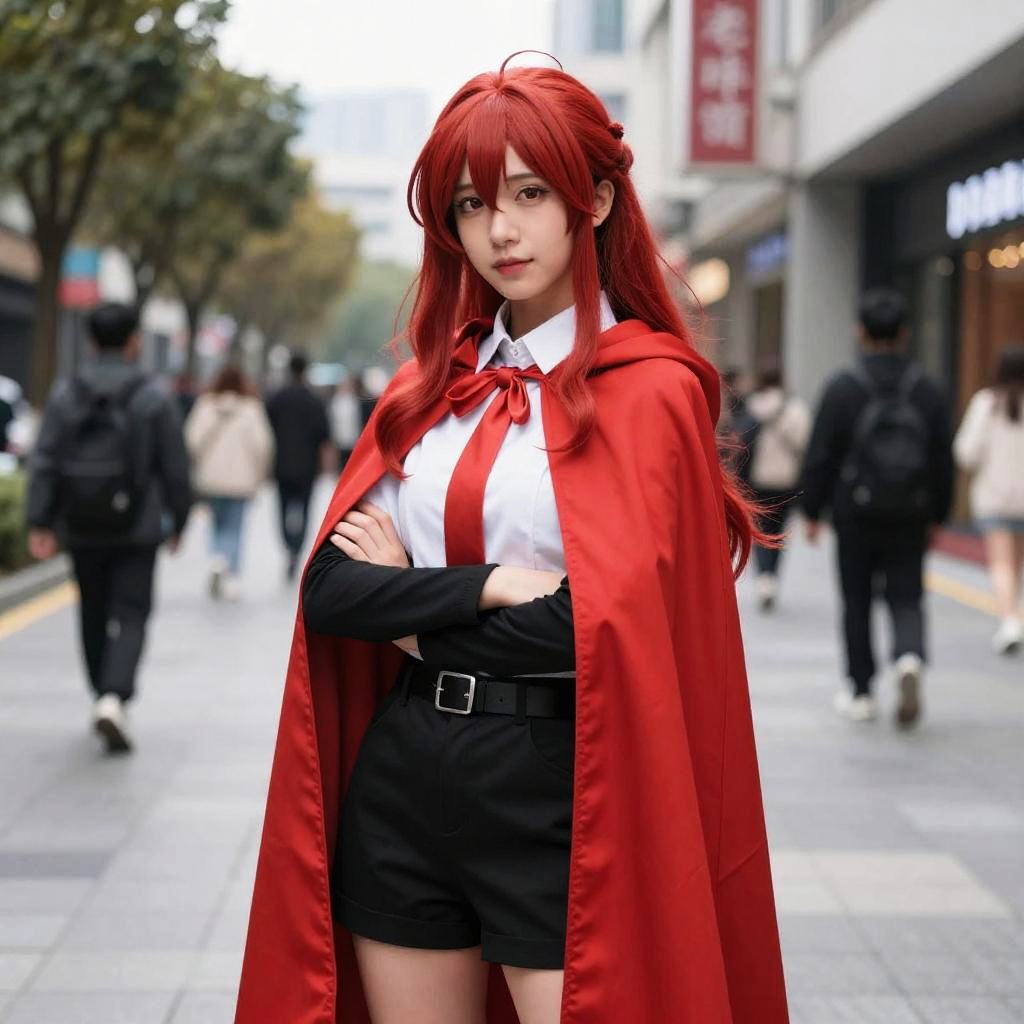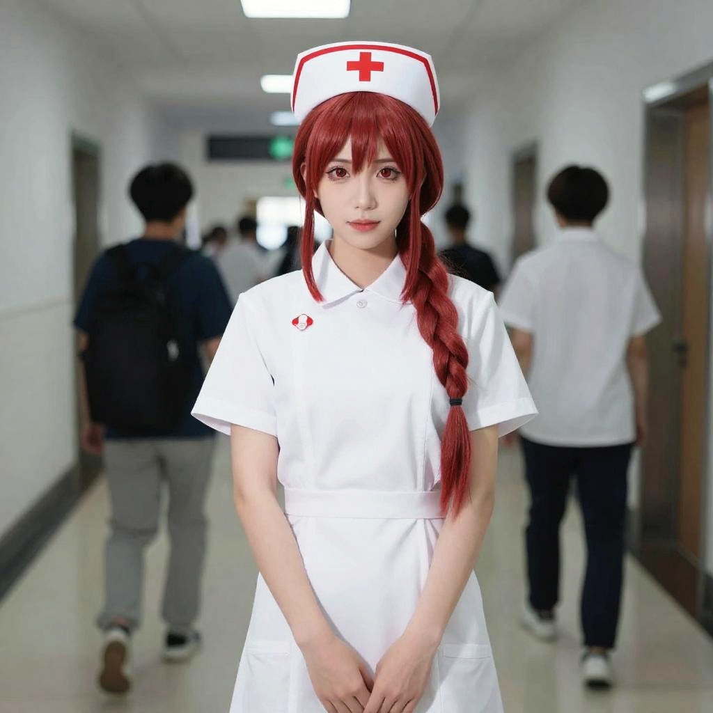 Young woman dressed in a white nurse cosplay uniform with a red cross nurse cap and long red braided hair, standing in a modern corridor with blurred people walking in the background. The setting appears to be an indoor hallway with fluorescent lighting.