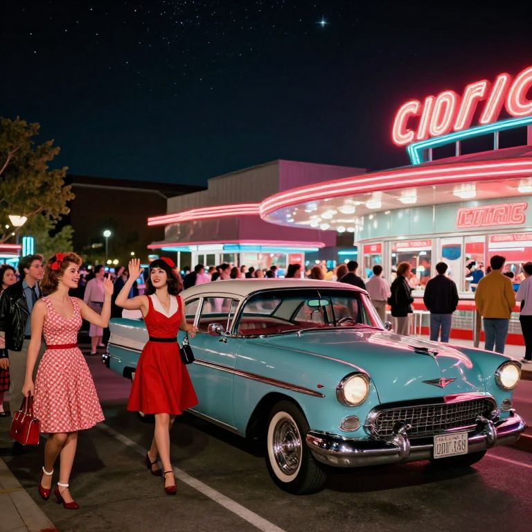 50's vibrant street scene with classic cars and fashion, neon signs glowing under a starry sky, people in retro dresses and leather jackets, a lively diner bustling with energy, capturing the nostalgic spirit of the 1950s.