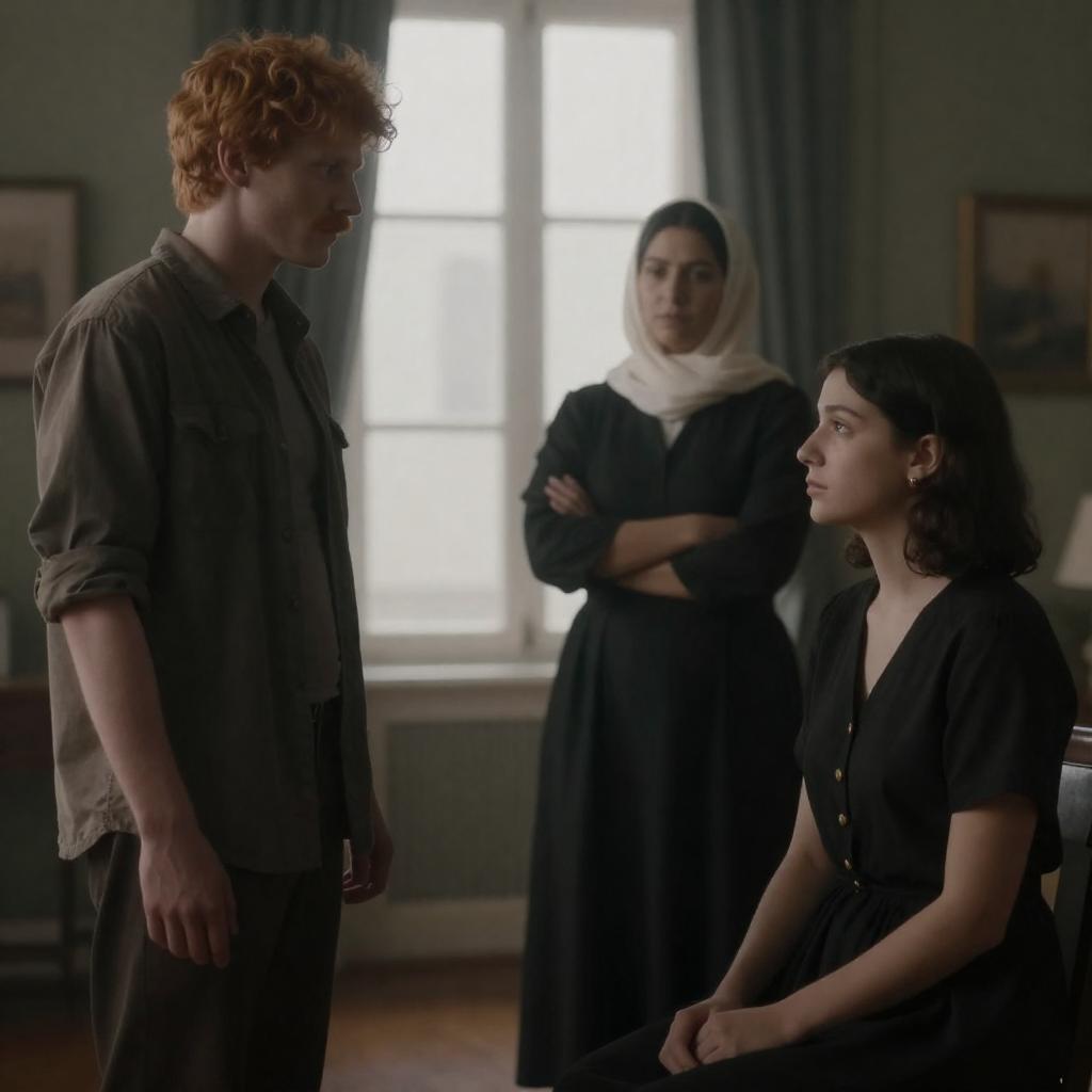 Photograph of a crowded room with dim lighting. Central figure: tall, fair-skinned man with reddish hair, white shirt, black vest, arms crossed. Surrounding people: diverse ages, various expressions, casual to formal clothing. Warm light from lamp on left. Background: blurred, indistinct.
