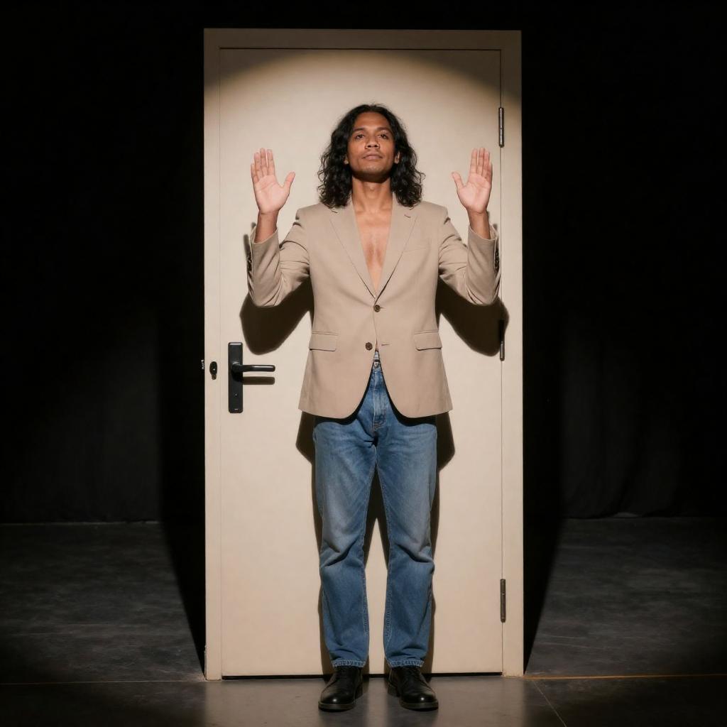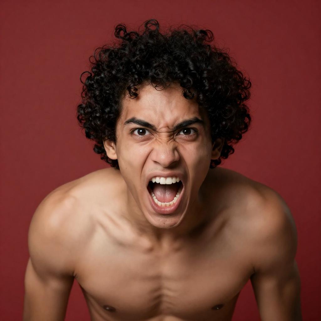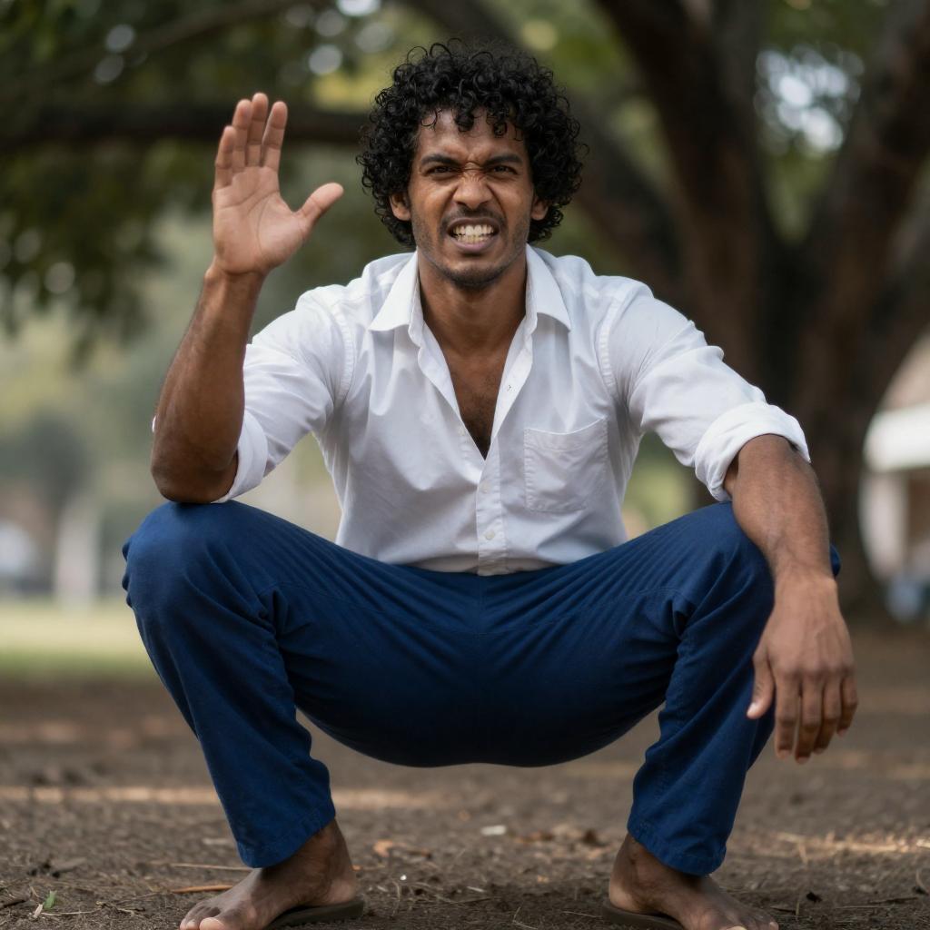 Photograph of a muscular man with dark skin and curly black hair, wearing a white, slightly unbuttoned shirt and loose blue pants, squatting with legs wide apart and right hand raised, fingers spread. Background features a sunlit, leafy tree. His expression is intense, mouth open, showing teeth. The ground is dark and ured.
