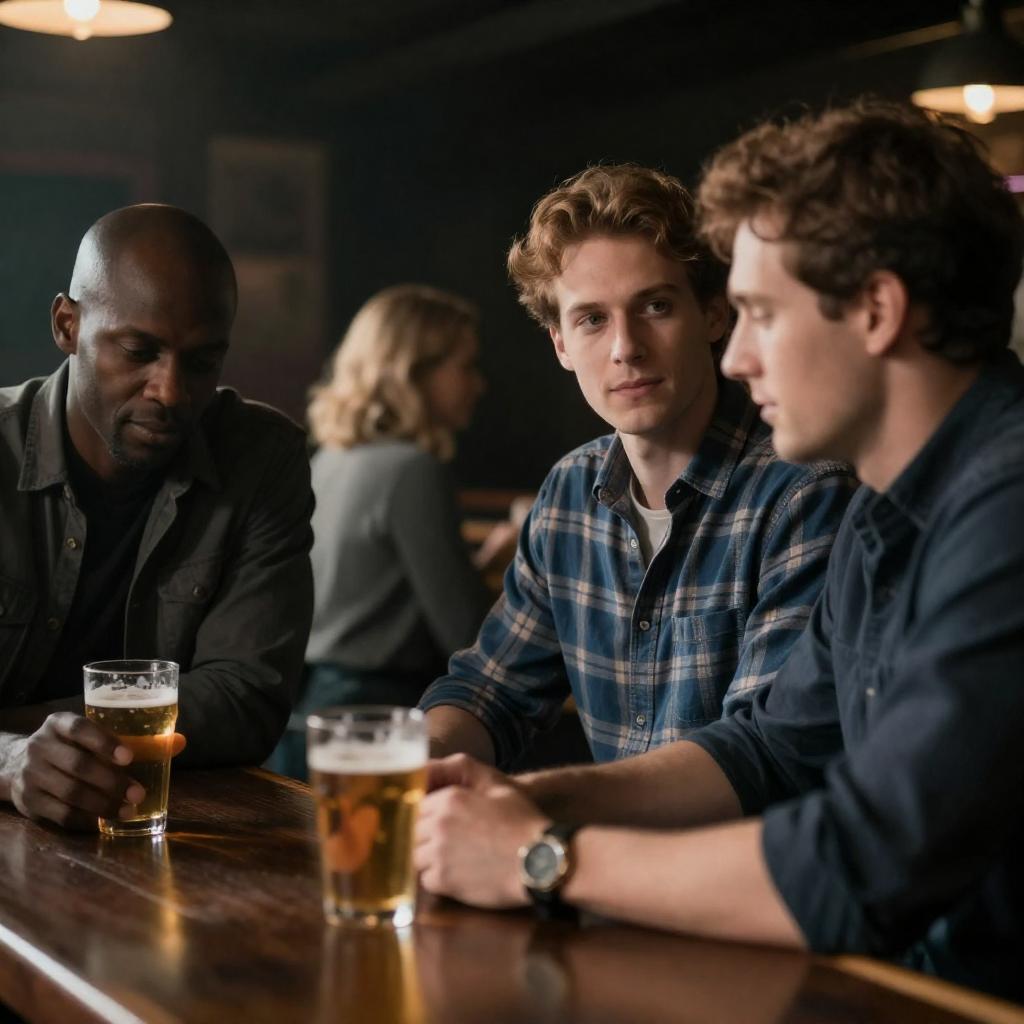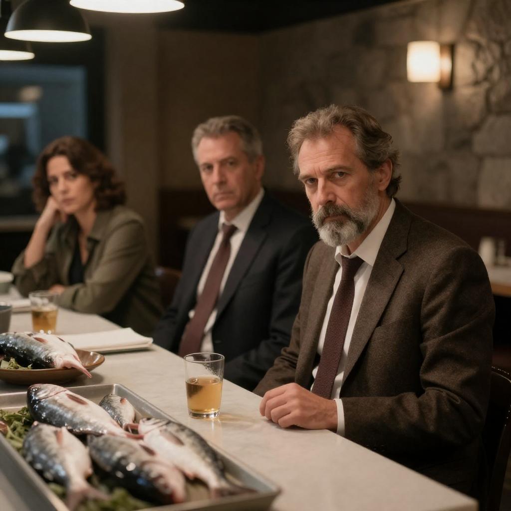 Middle-aged man with light brown hair in a blue suit, gesturing with his right hand, stands in a diner. Two other men sit at a table, one holding a beer bottle, the other partially visible. Background: tiled wall, shelf with bottles and a tray. Intense expressions.