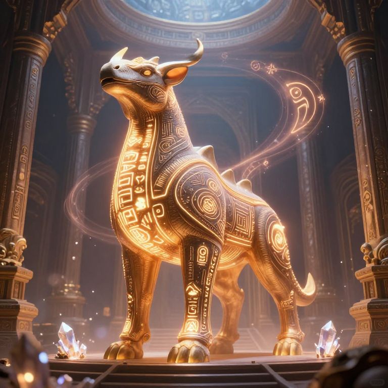 Biribeast as a guardian of an enchanted ancient temple, standing proudly with glowing runes etched on its body, surrounded by magical symbols swirling in the air, soft luminous light from crystals, majestic and mystical fantasy artwork with rich textures