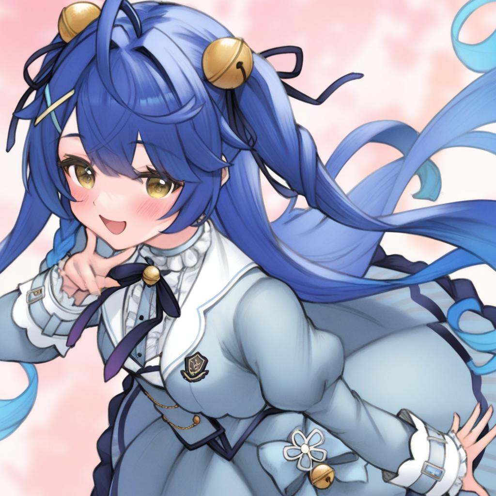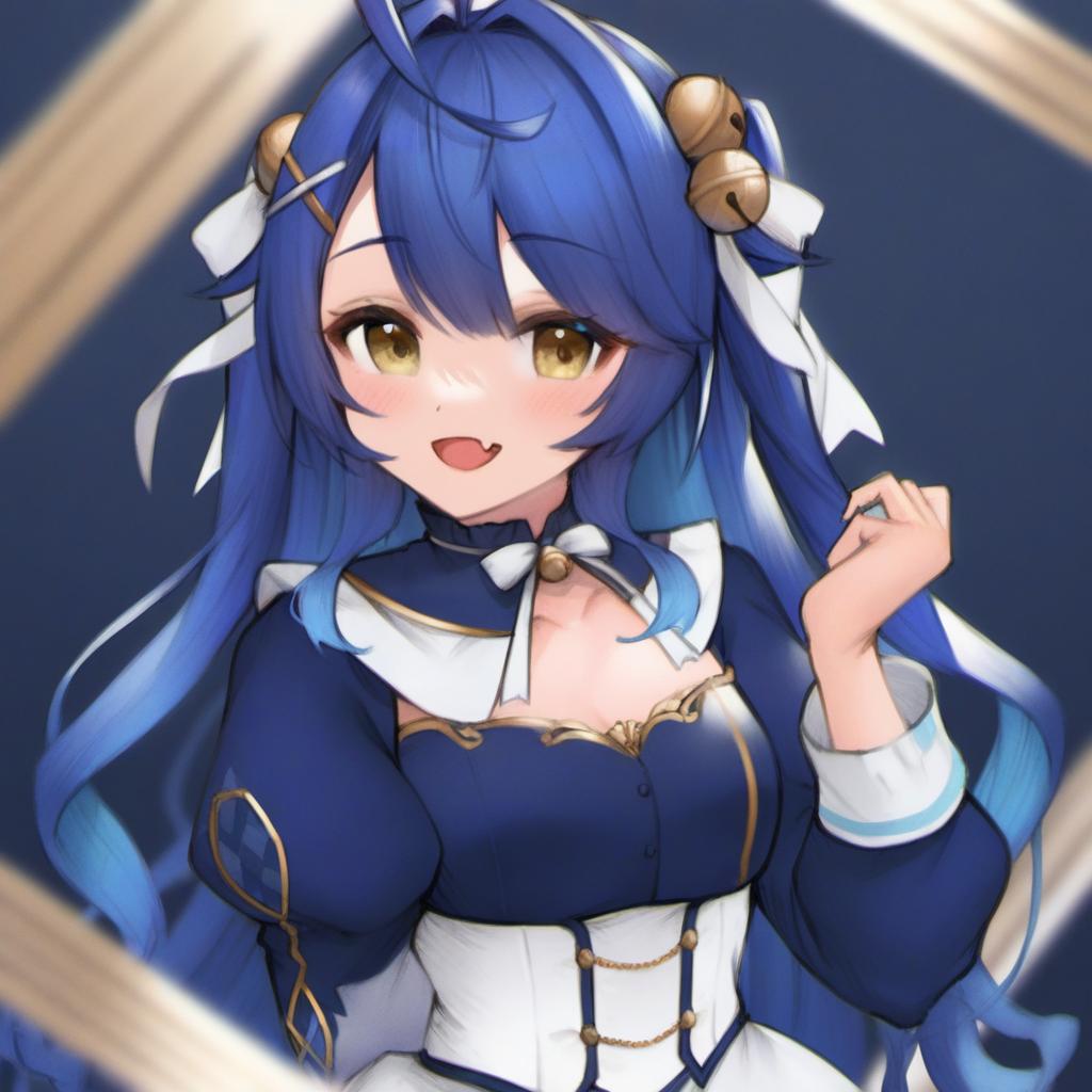 Amamiya kokoro, nijisanji, 1girl, skin fang, yellow eyes, hair between eyes, blue hair, very long hair, long hair, x hair ornament, ahoge, two side up, twintails, hair bell, hair ribbon, small breasts, virtual youtuber, virtual youtuber, jingle bell, by artist koretsuki azuma, leet