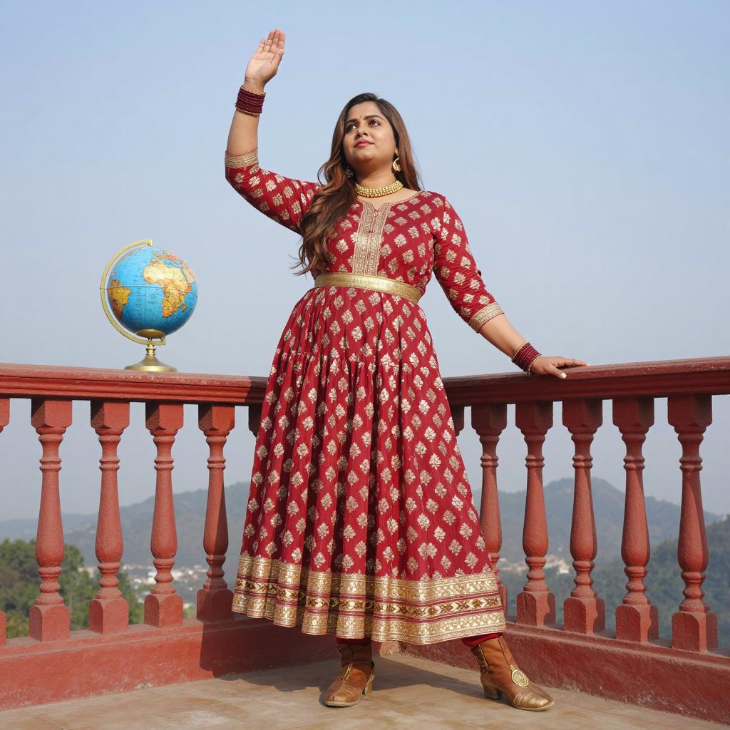 Photorealistic full-body shot of a plus size Indian woman standing on a red balcony with ornate balustrade and a panoramic view of mountains in the background. She is dressed in a red and gold patterned traditional Indian long dress with floral designs and a gold waistband. The dress has a short hem revealing brown boots with gold accents. She has long brown hair and wears matching jewelry including a necklace and bangles. Her right hand is raised confidently against a clear blue sky with soft daytime sunlight. A decorative globe rests on the balcony railing beside her.