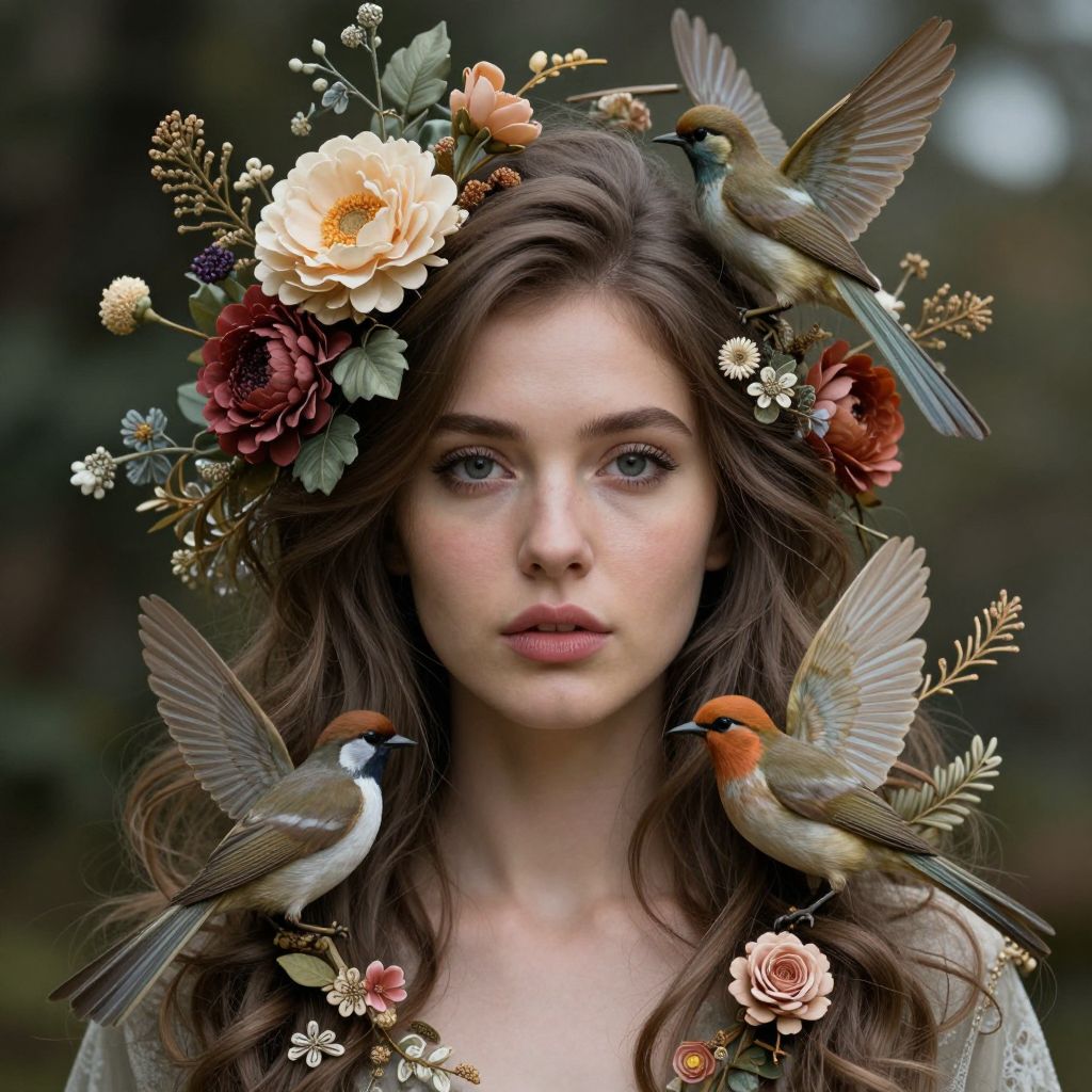 A detailed and intricate portrait of a woman adorned with floral and bird elements, set against a natural backdrop.