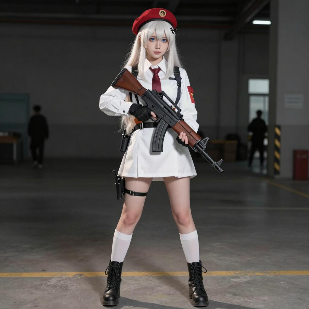 Photo-realistic cosplay photo of person in mp5 (girls' frontline) costume. Full body. Standing. Full length. 1girl, blue eyes, long hair, white hair, blonde hair, red headwear, submachine gun, beret, h&k mp5, professional photoshoot
