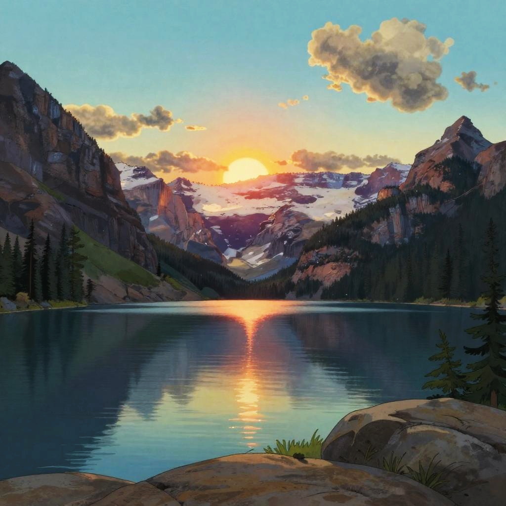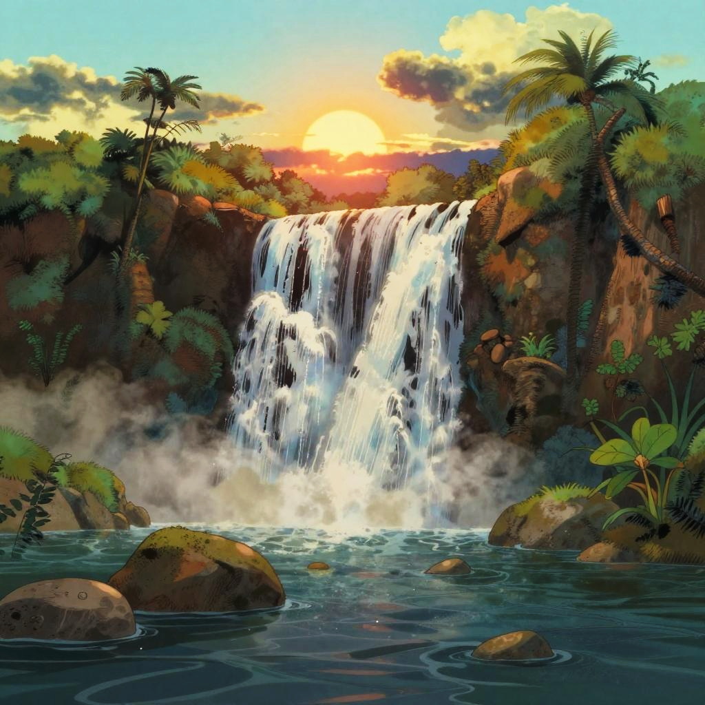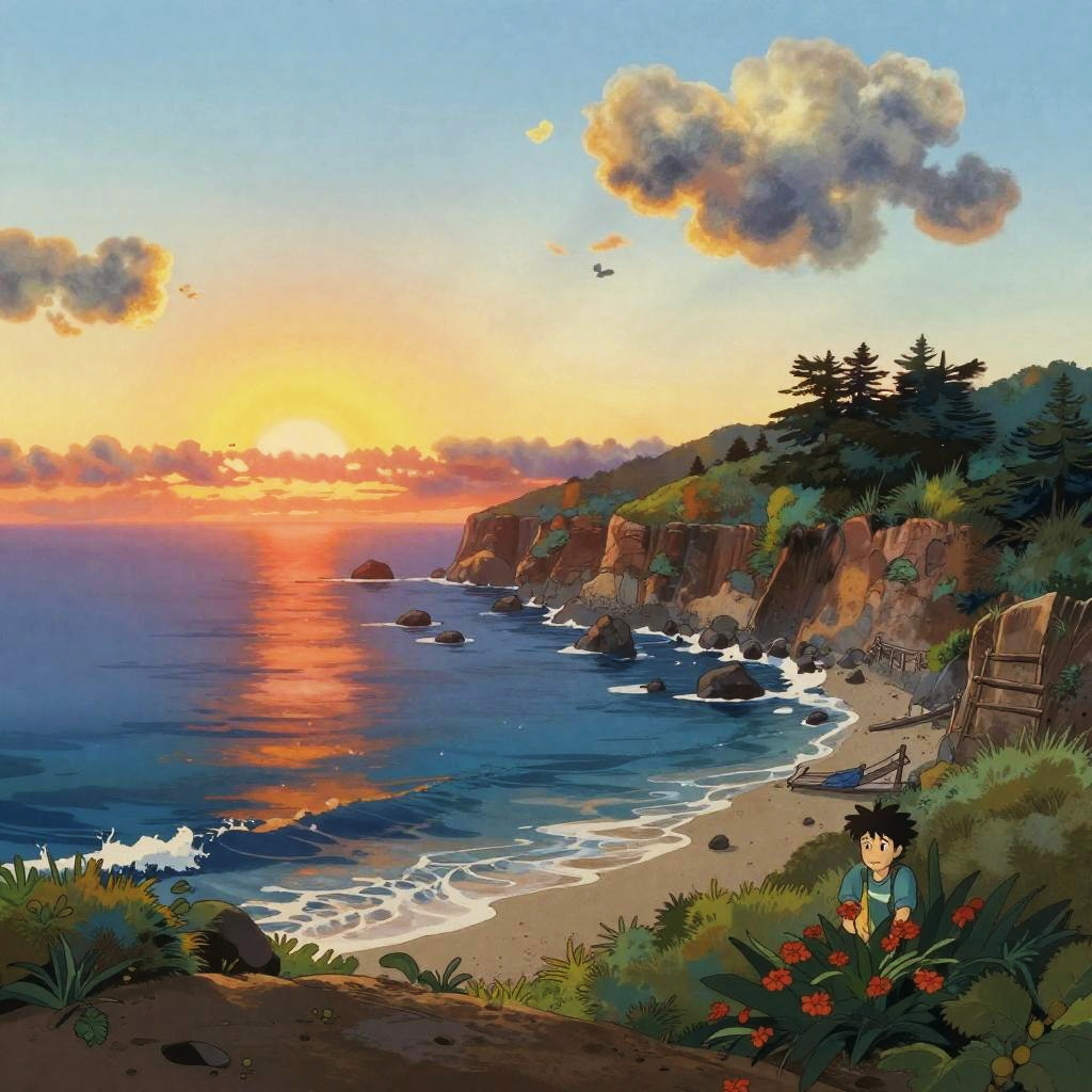 Wholesome animated key shot of an empty Galápagos Islands beach at sunset, Studio Ghibli, Pixar and Disney style, rendered in gouache painting, anime gouache key art by Yoh Yoshinari, bloom effect, dynamic lighting